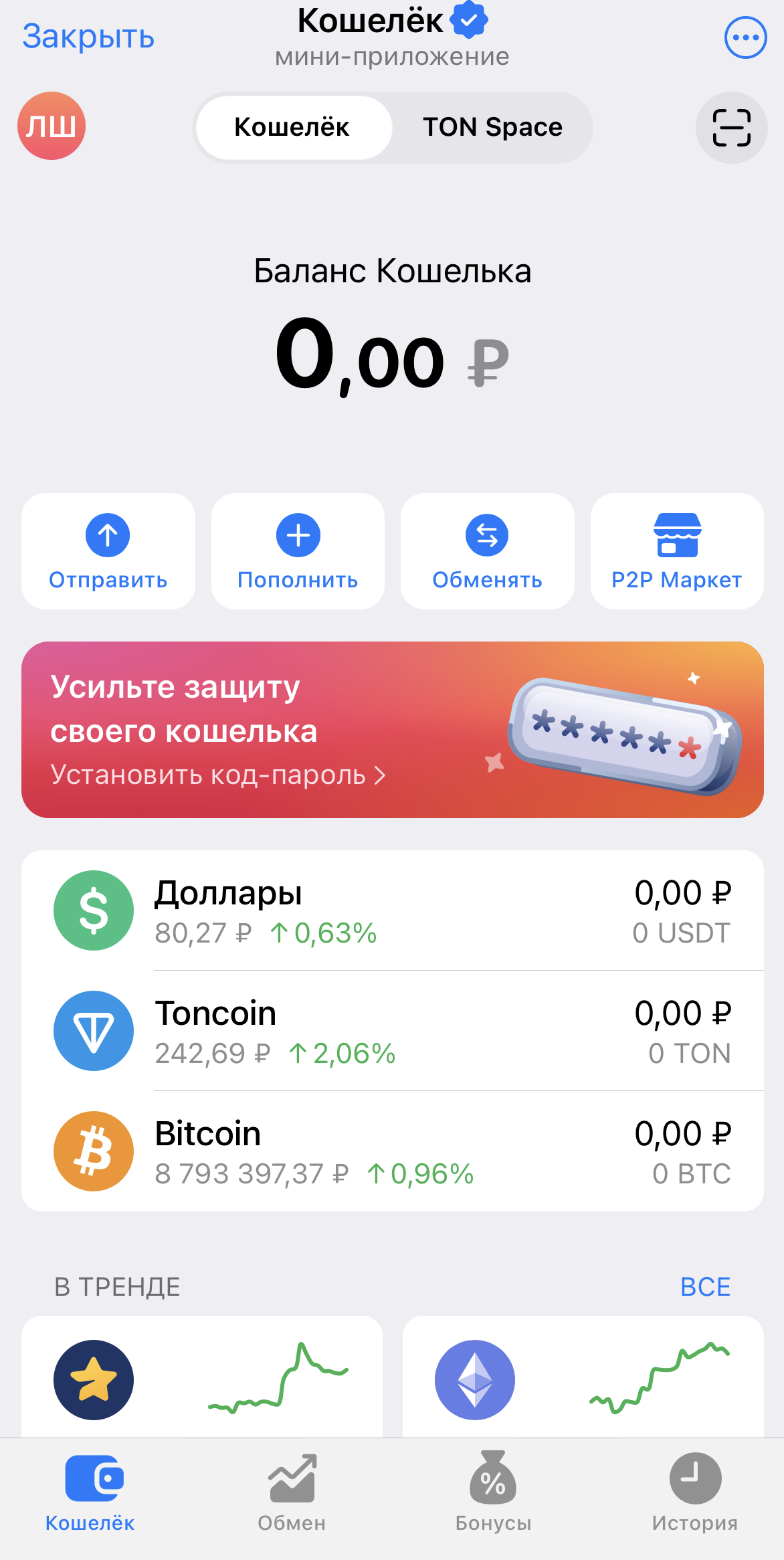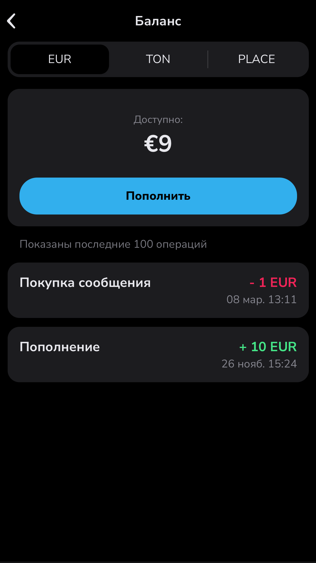 Если у вас нет TON, купите любое количество монет в Telegram-боте [@CryptoBot](https://t.me/CryptoBot), а также через [Mercuryo](https://mercuryo.io/) или [Neocrypto](https://neocrypto.net/). Затем переведите средства на кошелек Tonkeeper, так вы сможете пополнить баланс [Ton.Place](https://ton.place/).