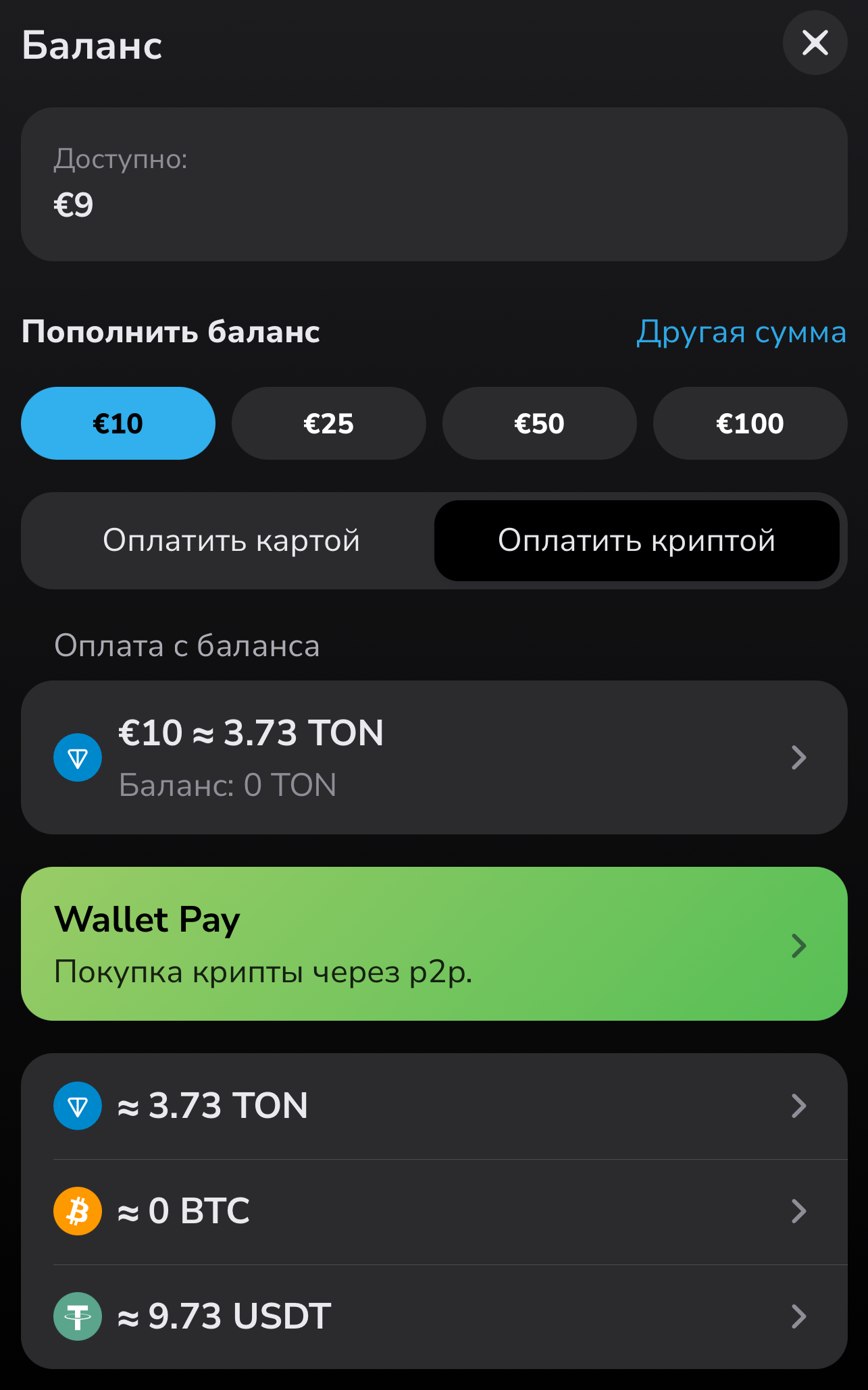 Для пополнения баланса в боте или личном кабинете выберите «Пополнить», укажите сумму и валюту. После этого переведите криптовалюту с внешнего кошелька.&#x20;